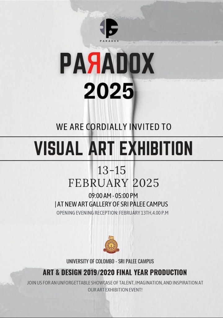 කොළඹ විශ්වවිද්යාලයේ ශ්රීපාලී මණ්ඩපයේ සිව්වන වසර දෘශ්ය කලාව හා සැලසුම්කරණ විද්යාර්ථින් සංවිධානය කරන PARADOX 2025 කලා ප්රදර්ශණය පෙබරවාරි 13 වැනිදා ශ්රිපාලි මණ්ඩපයේ නව කලාගාරයේදී පැවැත්වීමට කටයුතු සංවිධානය කර ඇත.