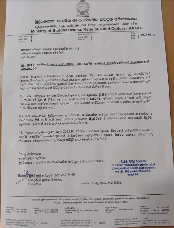 මෙම වැඩසටහන සම්බන්ධයෙන් ප්රදේශයේ බෞද්ධ ජනතාව දැඩි අප්රසාදය පලකරන බවට විවිධ පාර්ශ්වවලින් ලැබුණු පැමිණිලි අනුව එය නතර කරන ලෙසට දැනුම්දීමට බුද්ධ ශාසන ආගමික හා සංස්කෘතික කටයුතු නියෝජ්ය අමාත්යවරයා මෙම නිවේදනය මගින් කටයුතු කර ඇත.