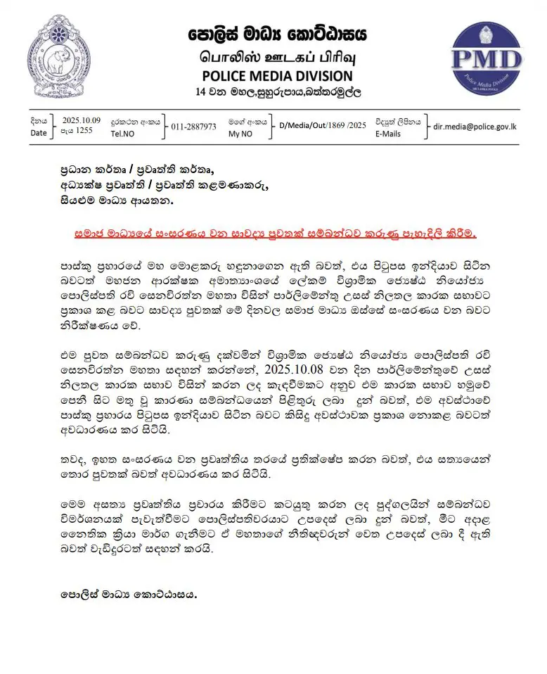 නිවේදනයක් නිකුත් කරමින් පොලිස් මාධ්ය කොට්ඨාසය සඳහන් කර ඇත්තේ, අදාළ පුවත තරයේ ප්රතික්ෂේප කරන බවත්, එය සත්යයෙන් තොර පුවතක් බවට අවධාරණය කරන බවයි.