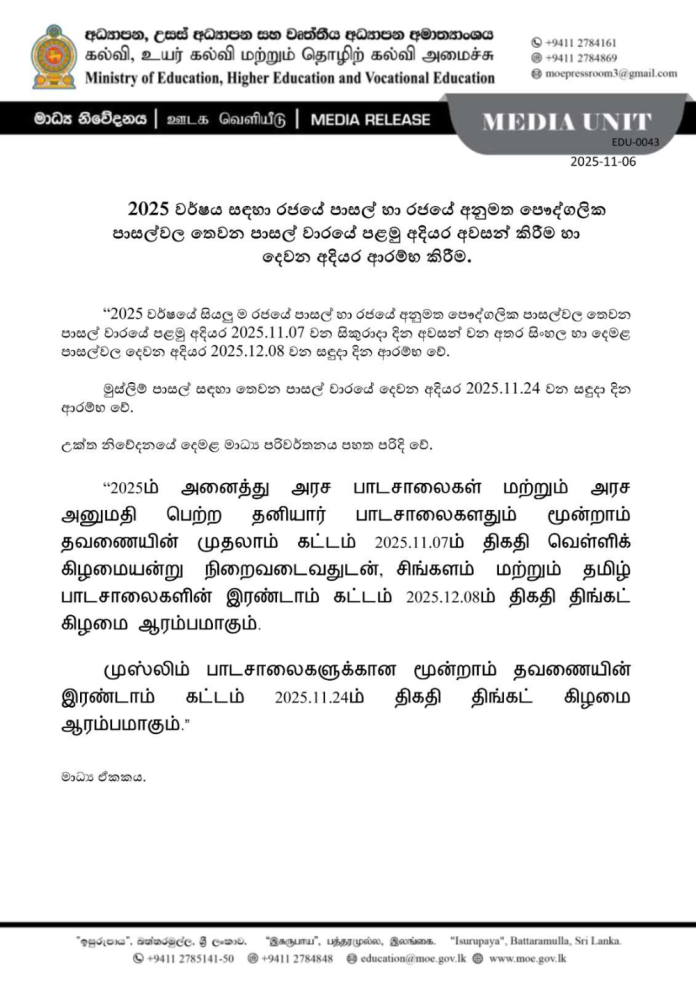 නිවේදනයක් නිකුත් කරමින් එම අමාත්යාංශය පවසන්නේ සිංහල හා දෙමළ පාසල්වල තෙවන පාසල් වාරයේ දෙවන අදියර දෙසැම්බර් 08 වන දින ආරම්භ වීමට නියමිත බවයි.
