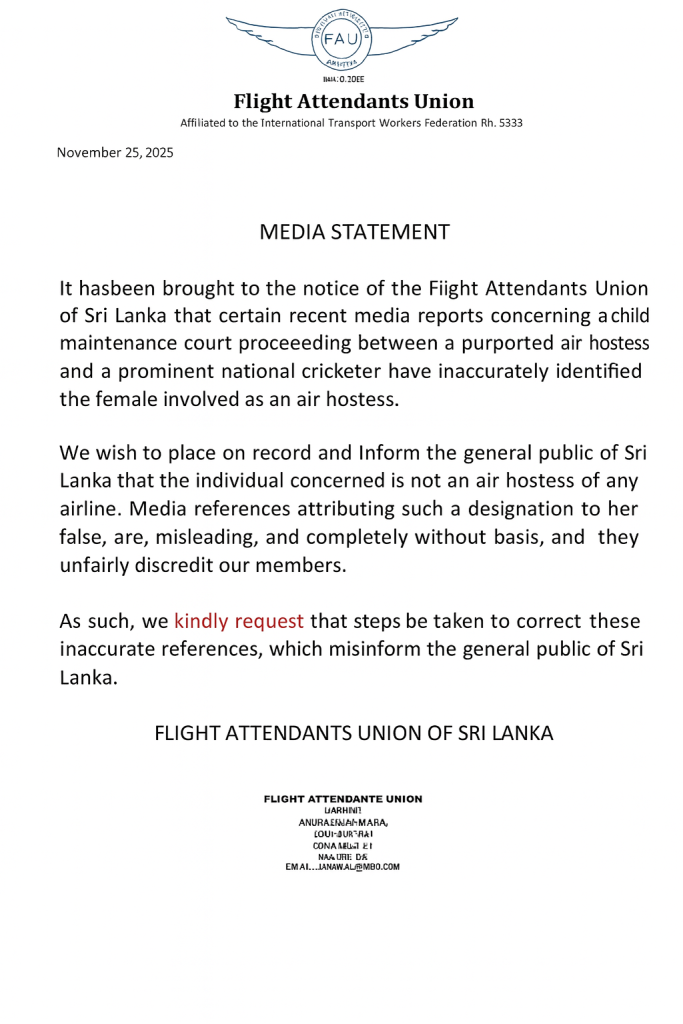 ශ්රී ලංකා ගුවන් සේවිකාවන්ගේ සංගමය නිකුත් කළ නිවේදනය පහතින්,