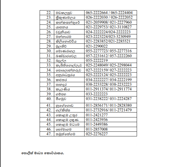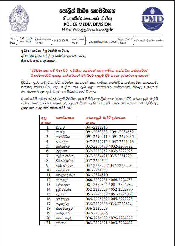 ඒ අනුව හදිසි අවස්ථාවන්වලදී මහජනතාවට ආපදා තත්ත්වයන් පිළිබඳව දැනුම් දීම පොලිසිය සඳහා දුරකථන අංකයන් හඳුන්වා දී ඇත.