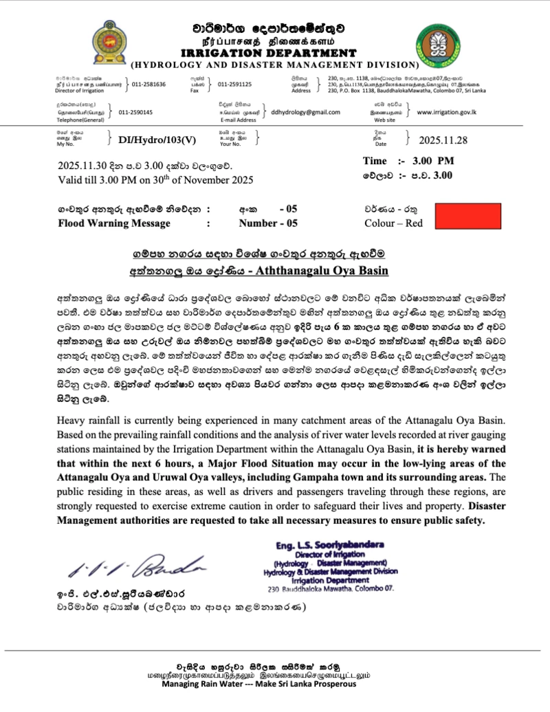 ඉදිරි පැය 6ක කාලය තුළ ගම්පහ නගරය හා ඒ අවට අත්තනගලු ඔය සහ උරුවල් ඔය නිම්නවල පහත්බිම් ප්‍රදේශවලට මහ ගංවතුර තත්ත්වයක් ඇති විය හැකි බවට වාරිමාර්ග දෙපාර්තමේන්තුව අනතුරු අඟවනවා.
