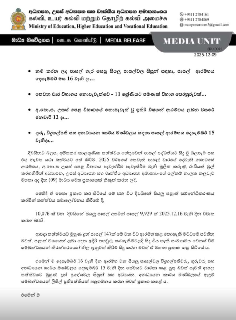 2025 වර්ෂයේ තෙවැනි පාසල් වාරයේ දෙවැනි අදියර 2025.12.16 දින සිට 2025.12.22 දින දක්වා පවත්වන අතර නත්තල් නිවාඩුවෙන් පසු නැවත 2025.12.29 දින සිට 2025.12.31 දින දක්වාත්, මුස්ලිම් පාසල් 2026.01.02 දින දක්වාත් පැවැත්වෙන බව ඔහු ප්රකාශ කරන ලදි.