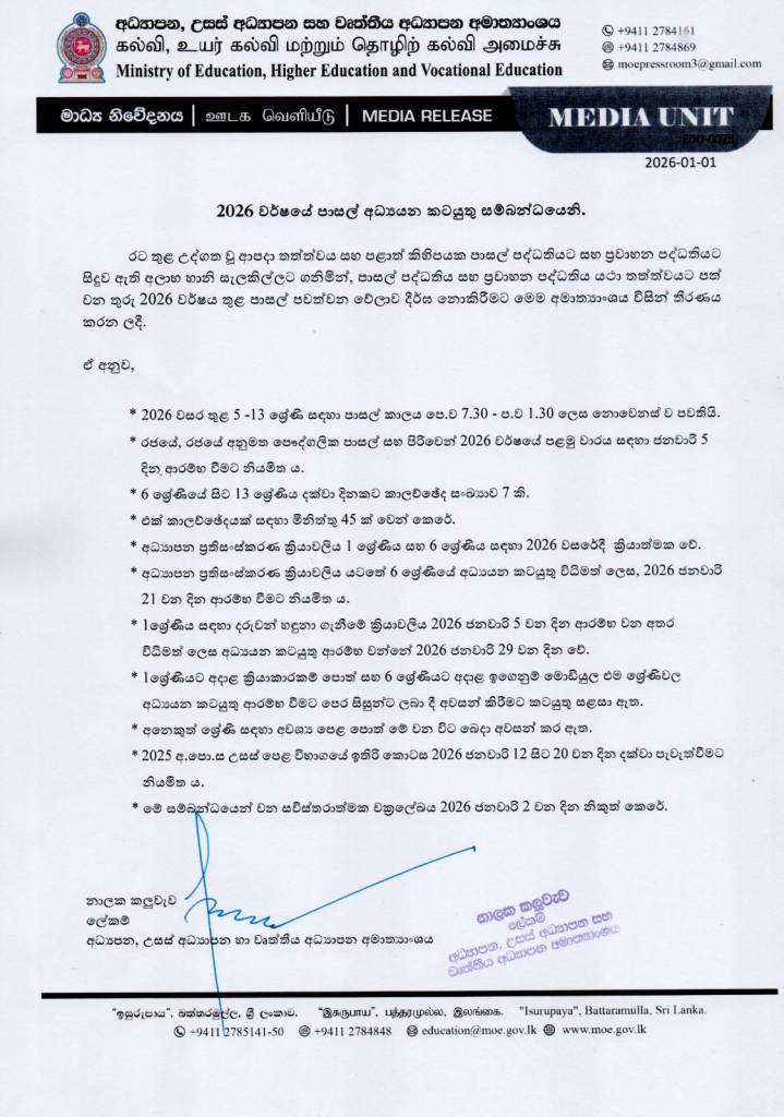 – 6 ශ්‍රේණියේ අධ්‍යයන කටයුතු 2026 ජනවාරි 21 වැනි දින විධිමත් ලෙස ආරම්භ වේ