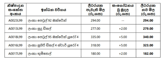 මිල සංශෝධනය අනුව ලංකා සුදු ඩීසල් ලීටරයක් රුපියල් 2කින්, ඔක්ටේන් 95 පෙට්රල් ලීටරයක් රුපියල් 5කින්, ලංකා සුපිරි ඩීසල් ලීටරයක් රුපියල් 5කින් සහ ලංකා භූමිතෙල් ලීටරයක් රුපියල් 2කින් ඉහළ ගොස් තිබේ.